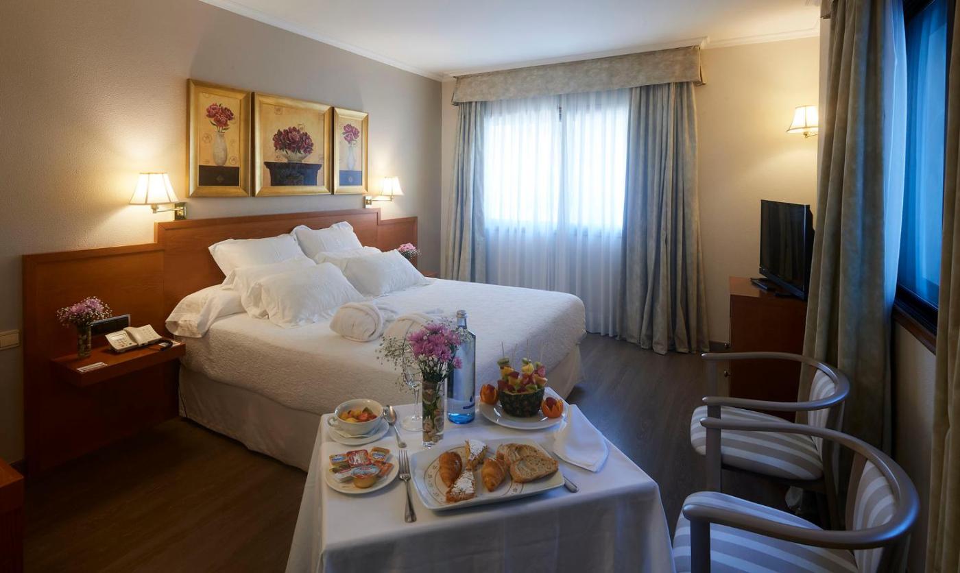 El desayuno consta de zumo, fruta, yogur, bollerÃa y té o café. Para el almuerzo y la cena se sirve comida tradicional gallega. La cafeterÃa del hotel sirve bebidas y refrescos, y los huéspedes pueden disfrutar del servicio de habitaciones de 13:30 a 15:00 y de 20:30 a 22:30.